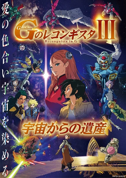 Gundam Reconguista in G Movie Part 3: Legacy from Space contains the anime film directed by Yoshiyuki Tomino, and is housed in a storage box featuring art by animation director Ikuro Kuwana and inner jacket art by mechanical designer Ippei Gyobu. It also includes a 16 page booklet in Japanese and English, Art Settings description guide, storyboard vol. 3 book, and 2 books of dubbing scripts vol. 3.