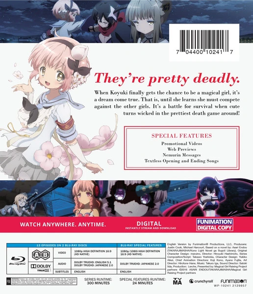 Magical Girl Raising Project Essentials contains episodes 1-12 of the anime directed by Hiroyuki Hashimoto.