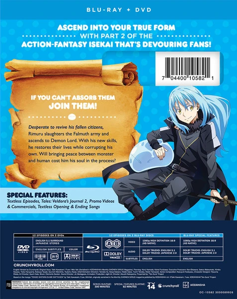Special Features: Tales: Veldora’s Journal 2 (Episode 36.5), Promo Videos, Commercials, Textless Episode 45 – Part B, Textless Episode 46 – Part A, Textless Episode 47 – Ending, Textless Episode 48, Textless Opening and Closing Songs.
