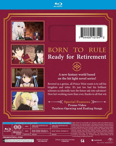 The Genius Prince’s Guide to Raising a Nation Out of Debt contains episodes 1-12 of the anime directed by Masato Tamagawa.