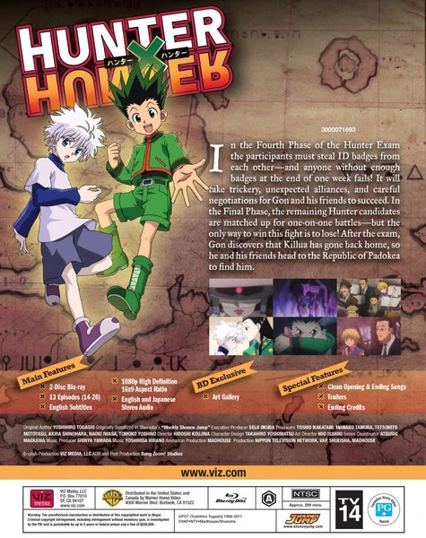 In the Fourth Phase of the Hunter Exam the participants must steal ID badges from each other—and anyone without enough badges at the end of one week fails! It will take trickery, unexpected alliances, and careful negotiations for Gon and his friends to succeed. In the Final Phase, the remaining Hunter candidates are matched up for one-on-one battles—but the only way to win this fight is to lose! After the exam, Gon discovers that Killua has gone back home, so he and his friends head to the Republic of Padokea to find him.